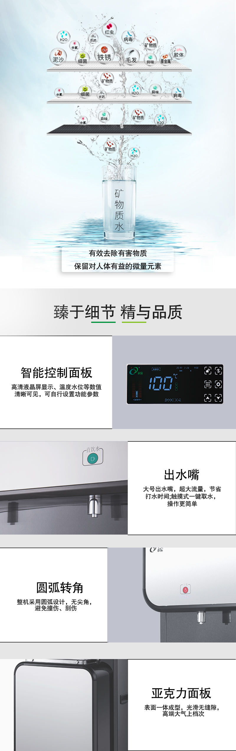 2. 步进加热:底部进水,逐层加热,逐层沸腾,完全实现冷热水分离,彻底解决普通直饮机“混合水”问题;