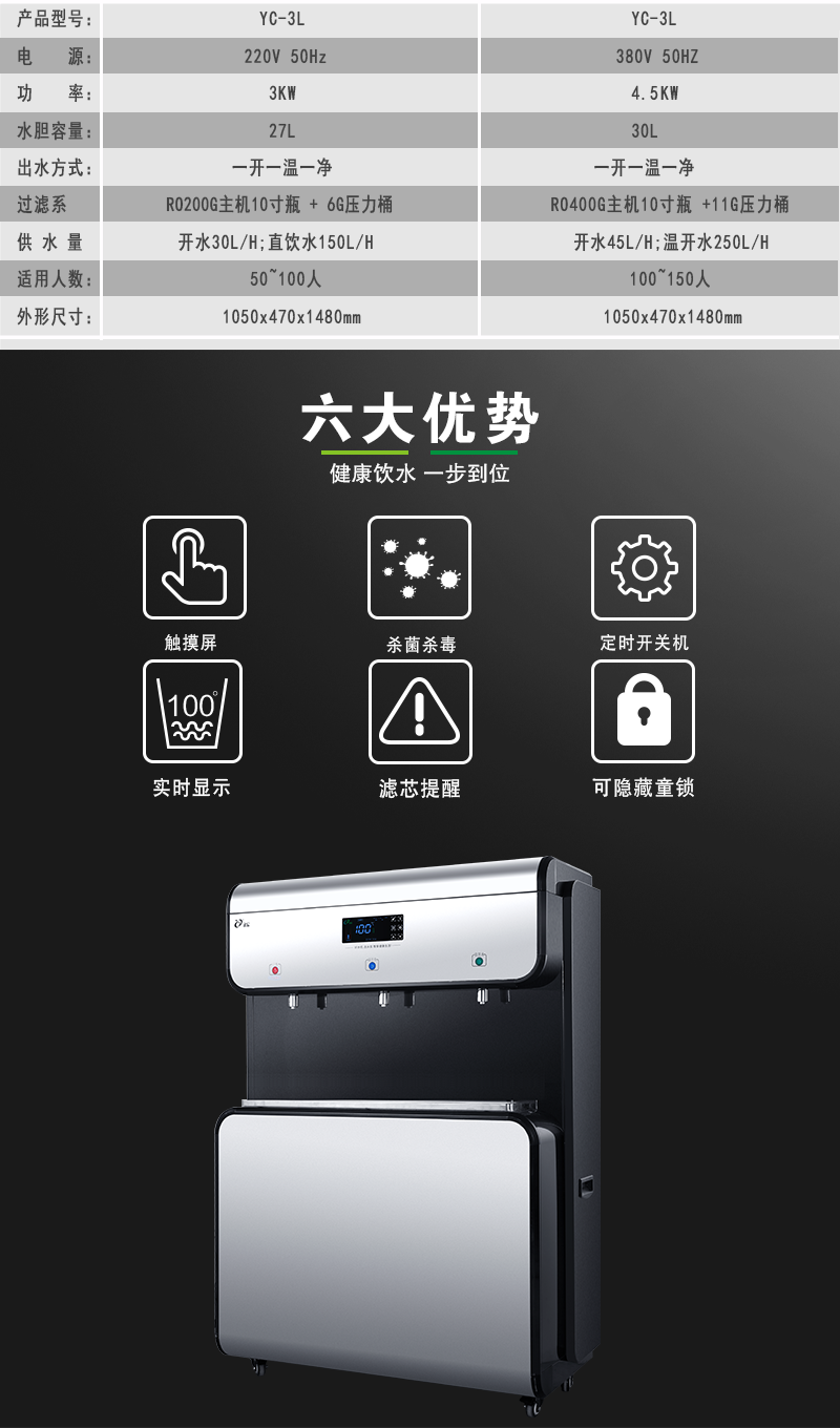 办公室饮用水问题当然是安装目前最为先进的办公室直饮水机,但是市面上有很多类型的直饮水机,适合办公室安装的直饮水机有需要具备什么样的功能。我们先来了解一下市面上的直饮水机,现在很多直饮水机,分为只是制造直饮水的反渗透净水机以及具备加热制冷功能的一体式直饮水机。办公室饮用水与工厂相比要求更高,因为办公室人员日常饮水主要是开水、温开水、常温水这三种出水水温,开水主要是用来冲咖啡、泡茶等,温开水是可以直接饮用,而常温水则是适合夏天天气炎热的时候饮用。