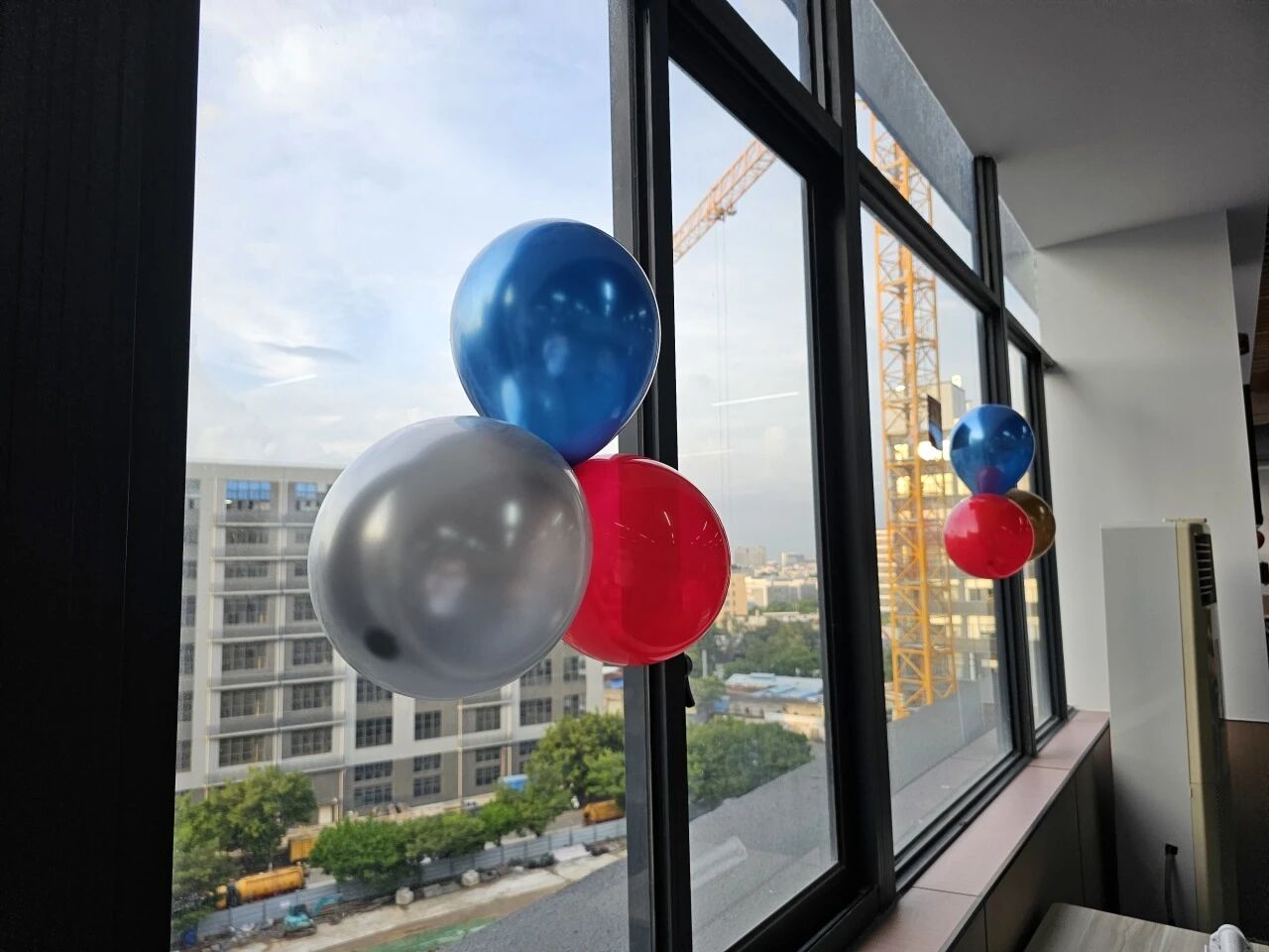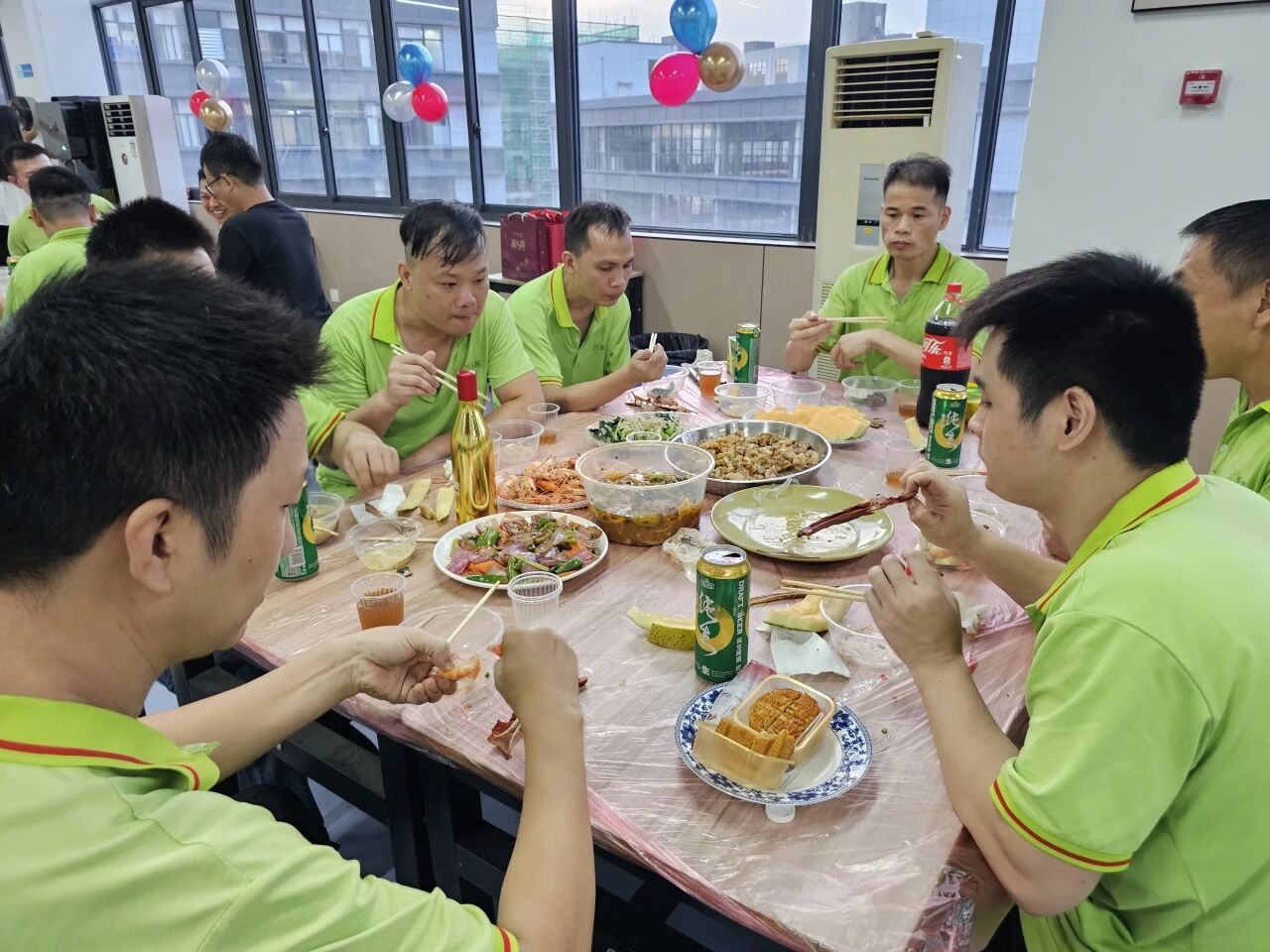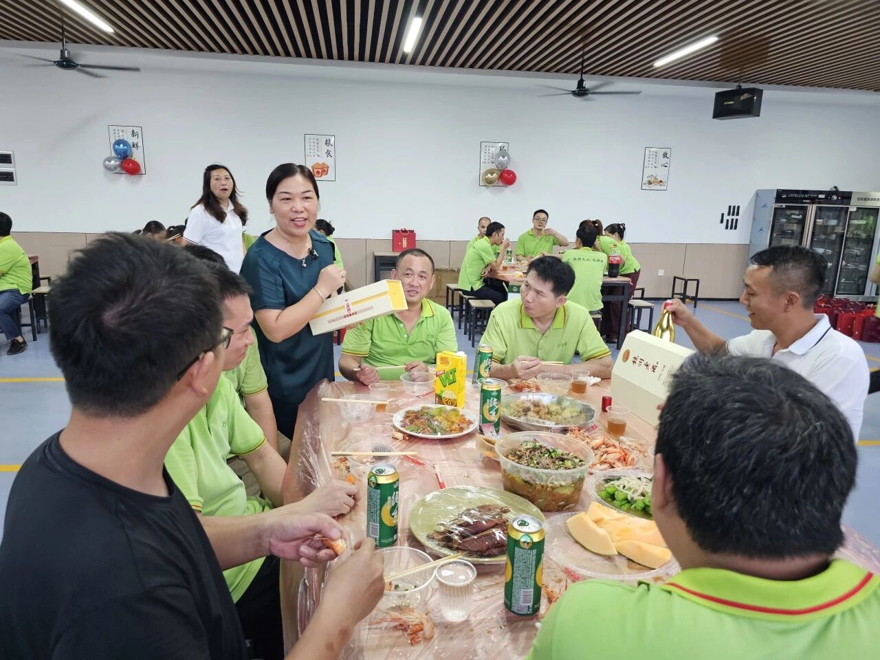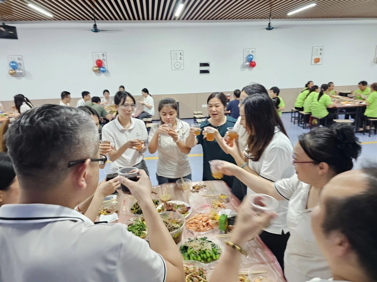 员工食堂经过悉心布置,红色桌布、五星红旗与精致的气球相互映衬,洋溢着浓厚的节日氛围。