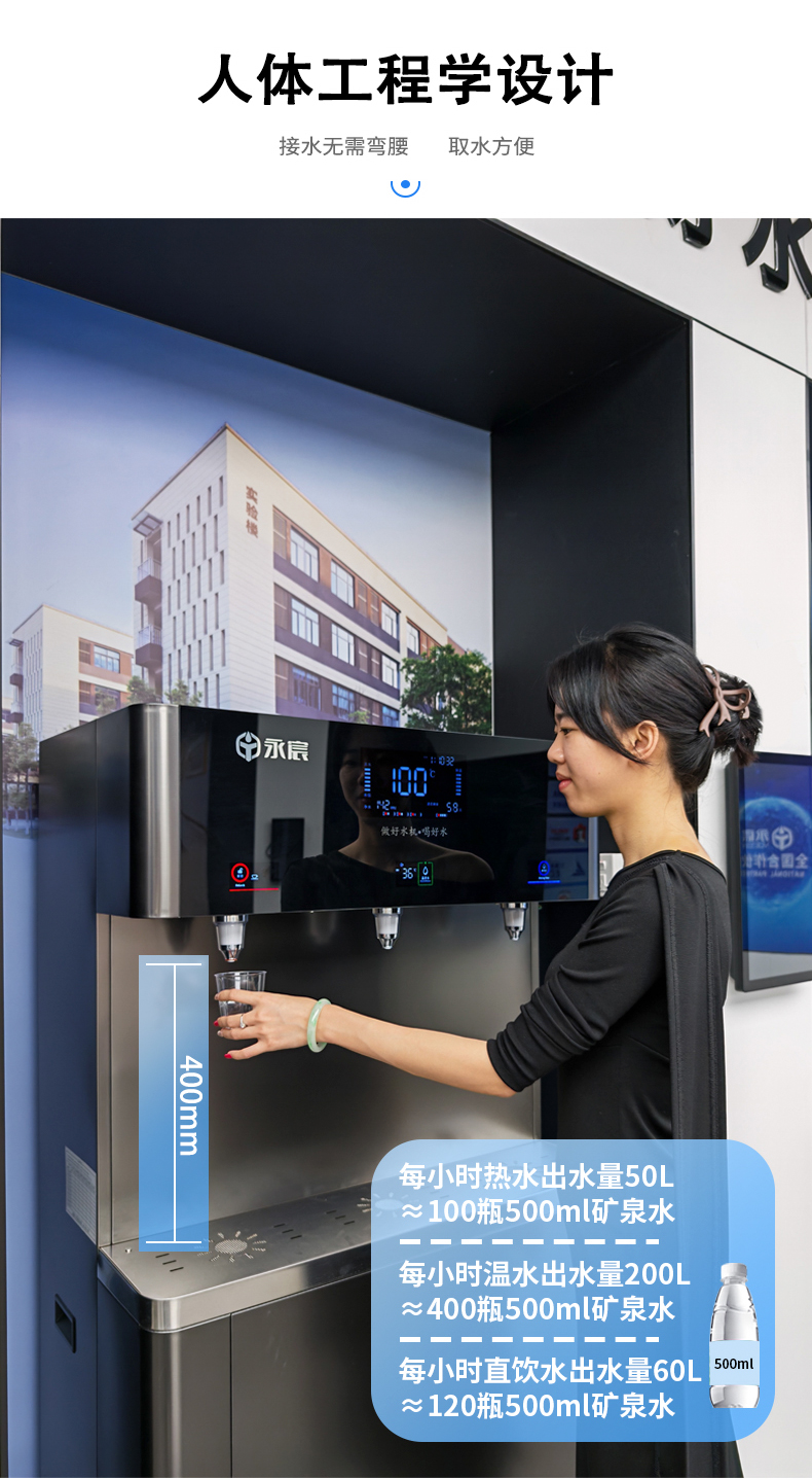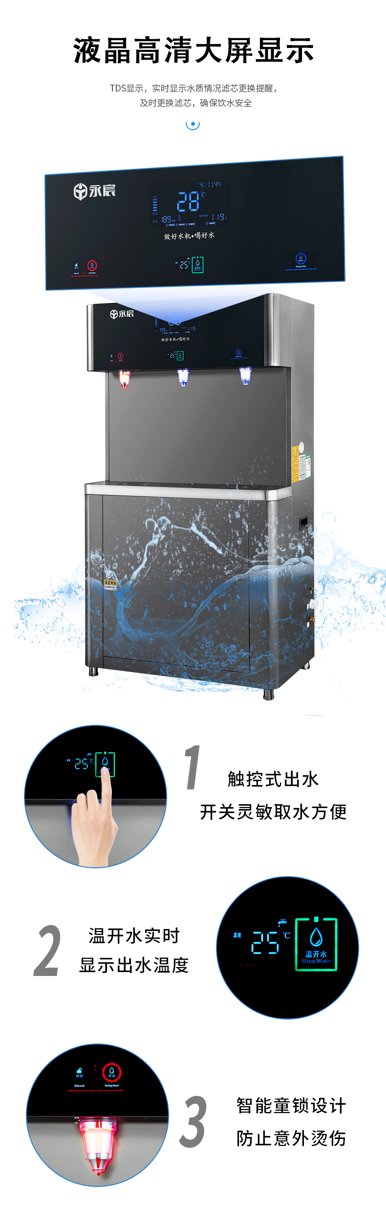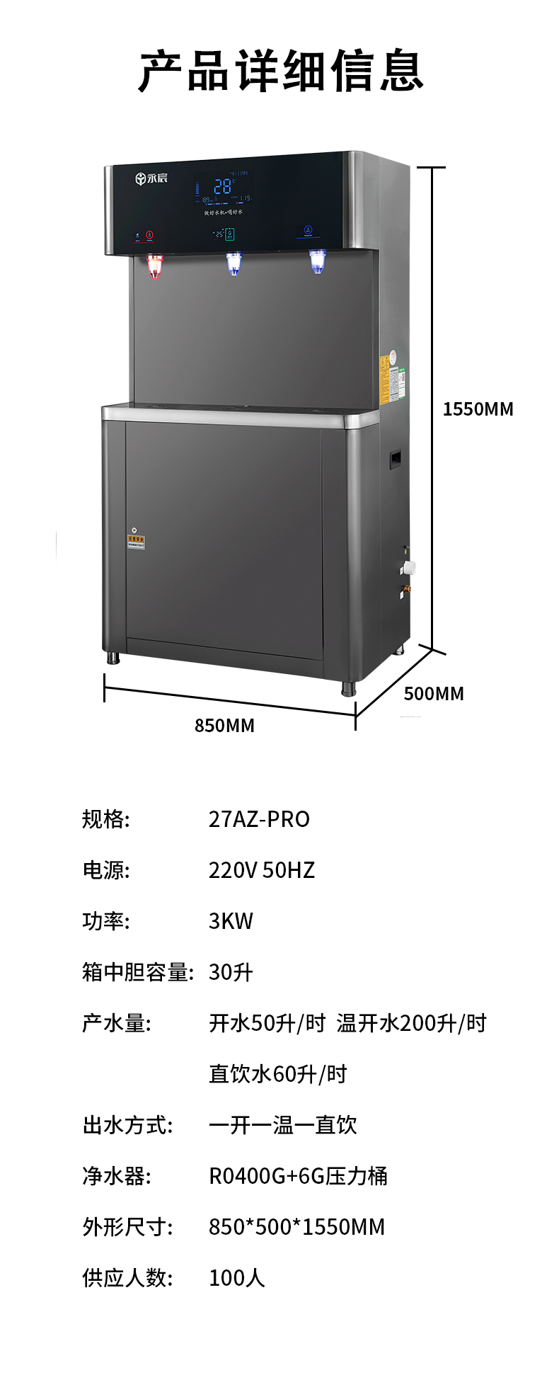 产水量:开水50L/H;温开水200L/H;直饮水60L/H