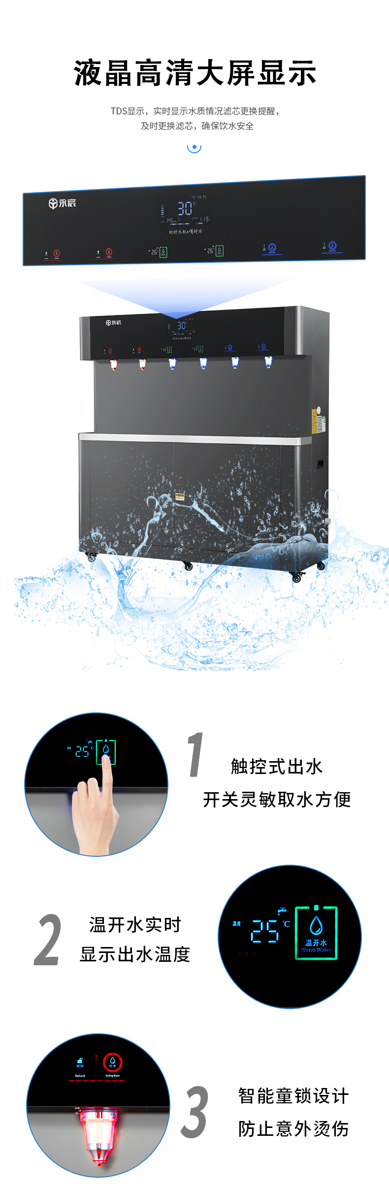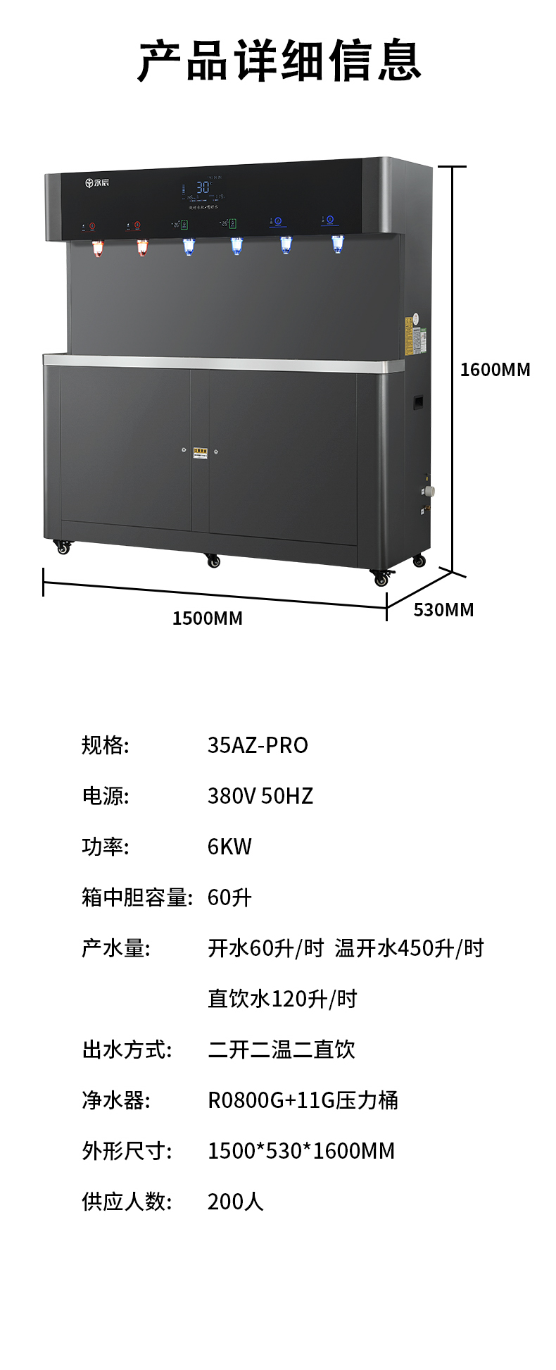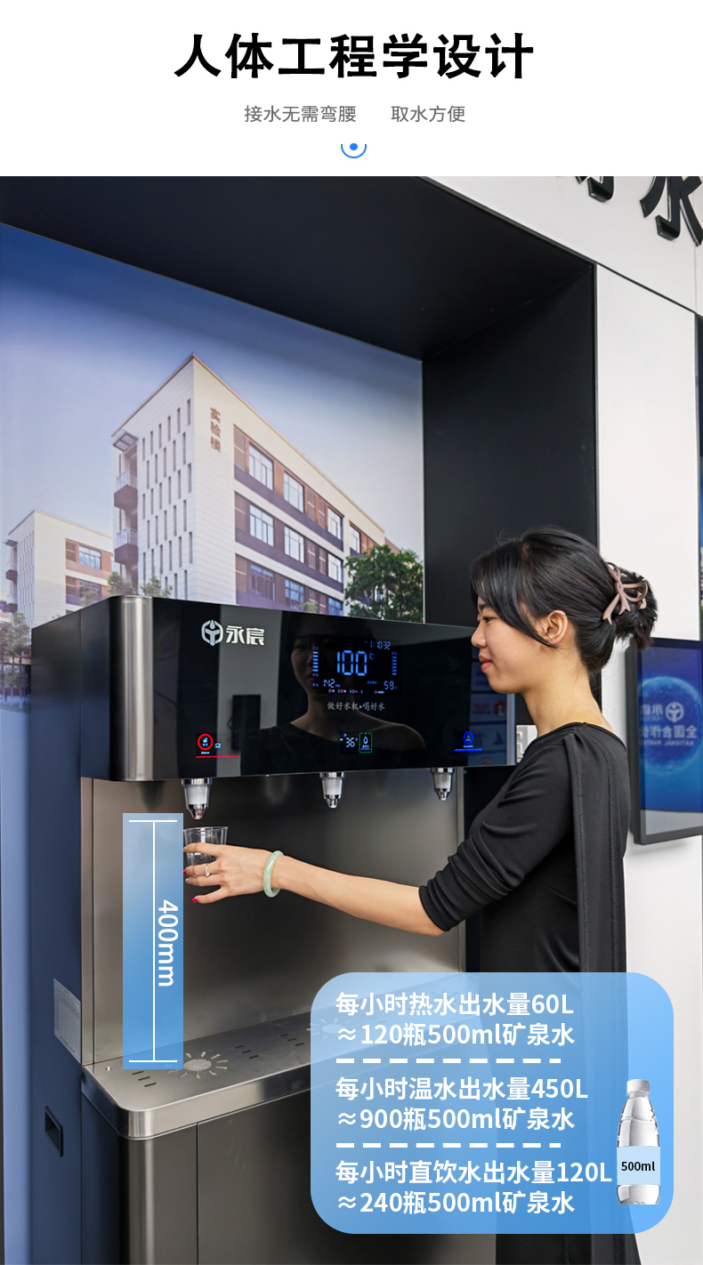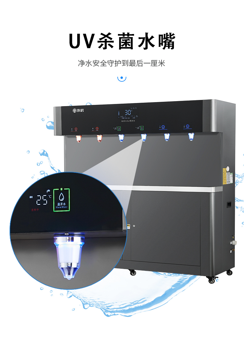 产水量:开水80L/H;温开水450L/H;直饮水120L/H